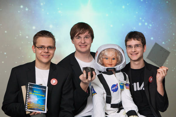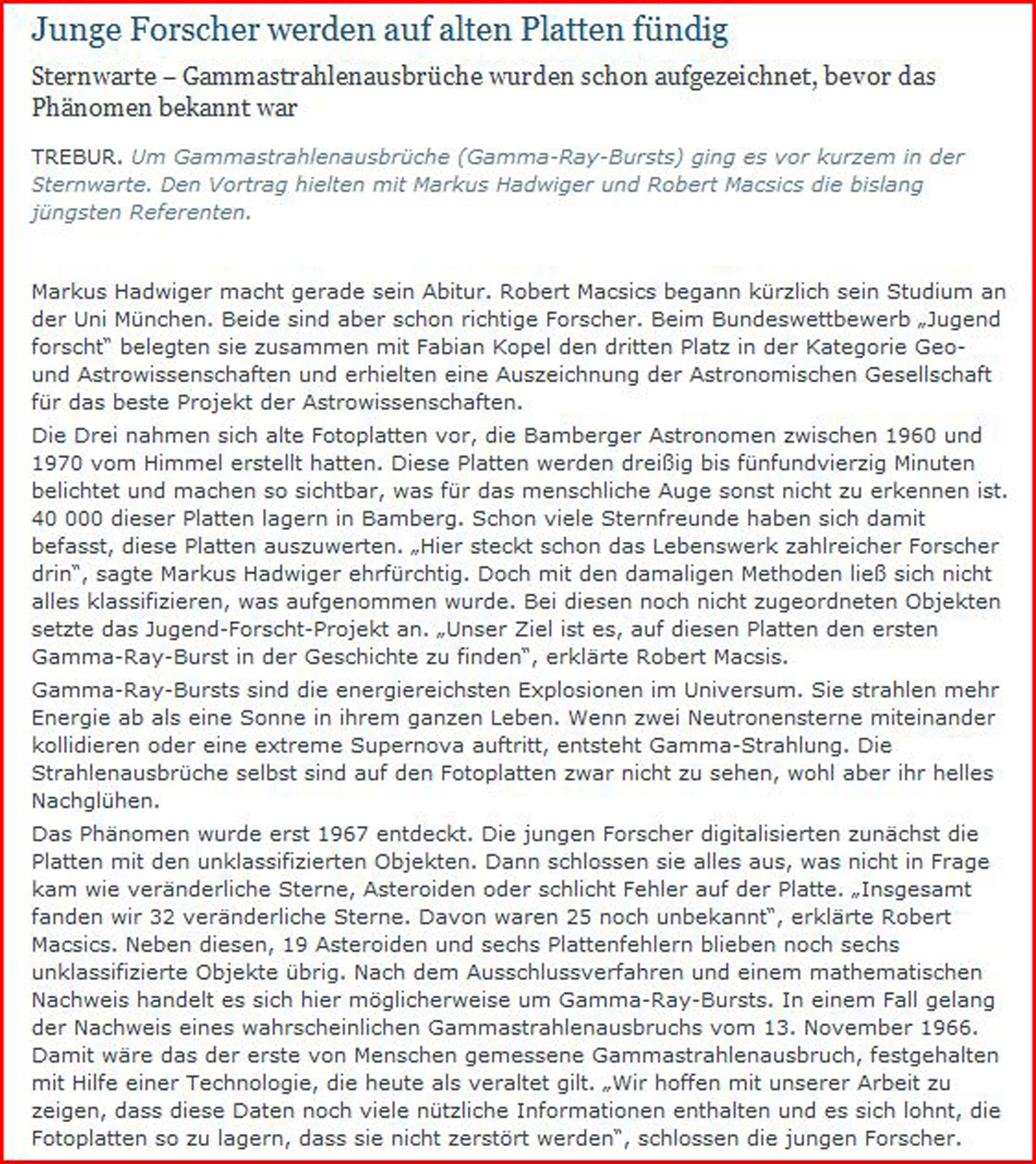 Unsere Tätigkeit bestand darin, Optical Transients, deren Ursache bis heute noch nicht geklärt werden konnte, zu charakterisieren und in einem Katalog zusammenzustellen. Hierbei überprüften wir mittels Internetdatenbanken, ob es sich bei den Objekten um Asteroiden oder veränderliche Sterne handelte. Letztere sind Sterne, die ihre Helligkeit mehr oder weniger periodisch ändern und daher nur auf der einen Platte sichtbar sein können, wenn sie sich zum Zeitpunkt der Aufnahme gerade in einer helleren Phase befanden, und auf der anderen Platte nicht, wenn sie hier leuchtschwächer waren. Außerdem untersuchten wir auch, ob es sich bei den genannten Objekten nur um bloße Plattenfehler handelt. Unsere letztendliche Hoffnung besteht darin, unter den Objekten eine Aufnahme eines Gamma-Ray-Bursts zu entdecken. Das sind kurzzeitige, hochenergetische Ausbrüche aus entfernten Galaxien, die sehr kurzwellige Gammastrahlung aussenden. Häufig folgt dieser ein optisches Nachleuchten im sichtbaren Spektralbereich, sodass Gamma-Ray-Bursts von Fotoplatten aufgenommen werden können. Sollten sich Objekte finden lassen, die keiner der drei oben genannten Ursachen zugeordnet werden können, bestünde die Möglichkeit, dass sich unter ihnen solch ein Gammablitz befindet, was sich unter anderem untermauern ließe, wenn sich an der Position des Objektes eine Galaxie befände. Sollte die Entdeckung gelingen, wäre es der früheste bekannte Gamma-Ray-Burst und der erste, der über Fotoplatten nachgewiesen wurde. Nach aktuellem Stand unserer Forschungen konnten wir aus anfänglich 63 untersuchten Objekten 17 Asteroiden, 6 Plattenfehler und 32 veränderliche Sterne identifizieren. Acht Objekte sind wahrscheinlich keiner der drei Charakteristika zuzuordnen und daher die verbliebenen Kandidaten für einen Gamma-Ray-Burst. Ihre Koordinaten wurden zu modernen Teleskopen gesendet, um aktuelle Aufnahmen von den Positionen zu erhalten. | ![]() Markus Hadwiger, Fabian Kopel und Robert Macsics (v.l.; Foto: Wacker Chemie AG) |